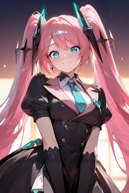 laylaaspirant, 매우 긴 머리, 분홍색 머리, 더블테일, 앞머리, 머리 장식, 하늘색 눈, 파란색 넥타이, 흰색 셔츠, 검은색 드레스, 풍성한 짧은 소매, 팔꿈치 장갑, 허벅지 스타킹, 흰색 무릎 부츠레이라 블레이징 (리바이브):