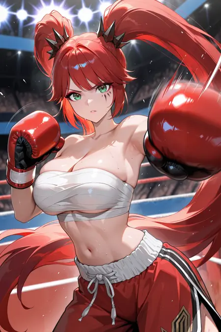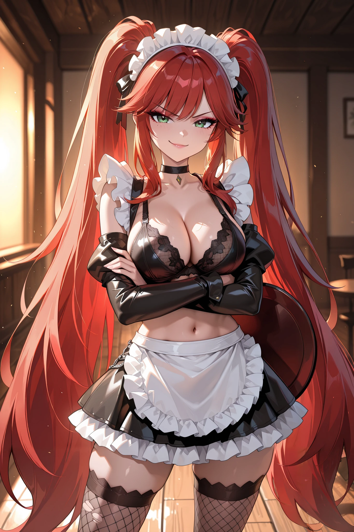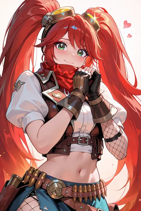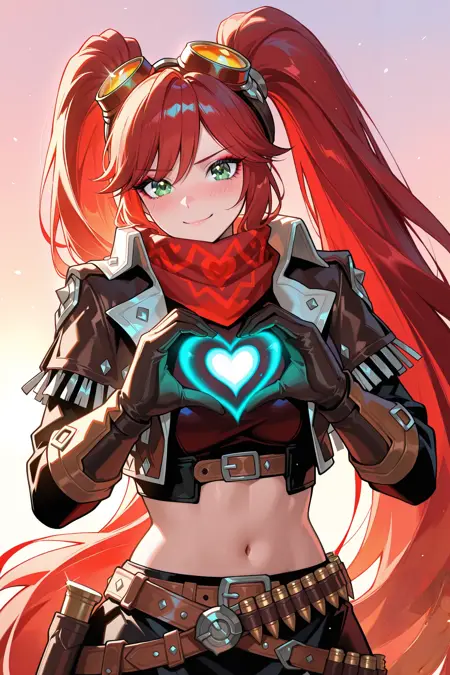 laylablazing, 매우 긴 머리, 붉은 머리, 더블테일, 앞머리, 녹색 눈, 마스카라, 머리에 안경, 가죽 재킷, 크롭된 재킷, 허리, 배꼽, 검은색 스커트, 붉은 스카프, 벨트, 총알, 탄알 띠, 장갑, 패션 네트 허벅지 스타킹, 부츠레이라 블레이징 (리바이브 이전):