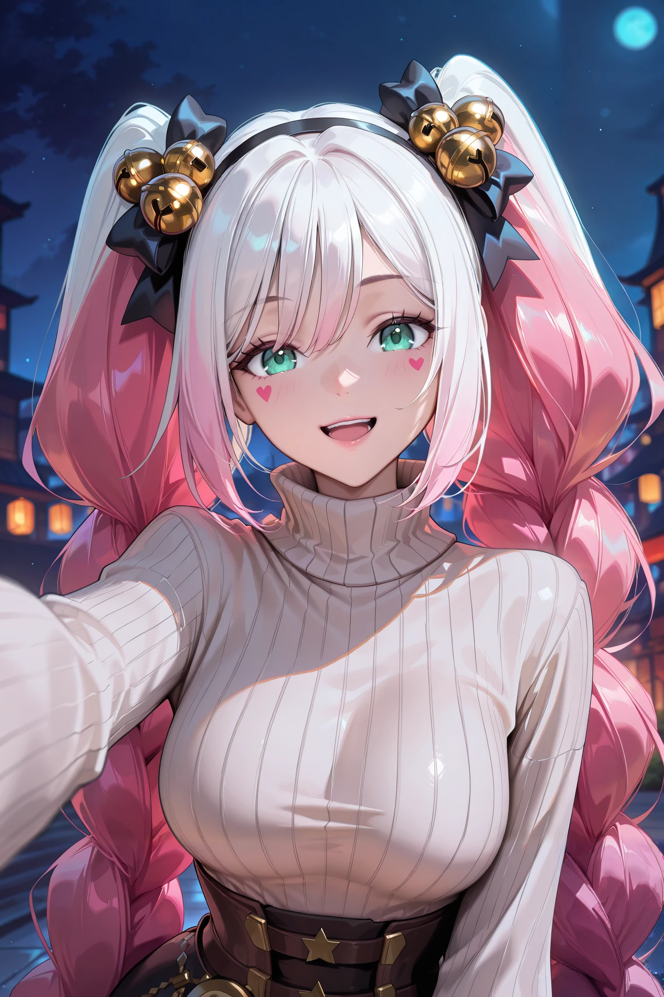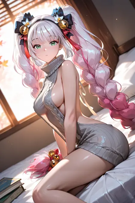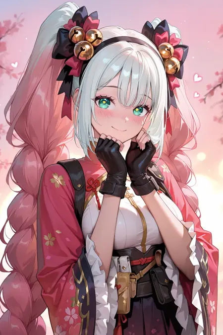 layla collector, 매우 긴 머리, 흰색 머리, 분홍색 머리, 검은색 머리끈, 더블테일, 더블 브레이드, 앞머리, 머리 장식, 머리 종, 머리 리본, 일본식 복장, 넓은 소매, 긴 소매, 드레스, 프릴, 주머니, 손가락 없는 장갑, 스커트, 무릎 패드, 양말, 빨간 신발