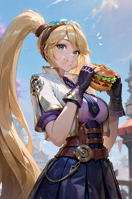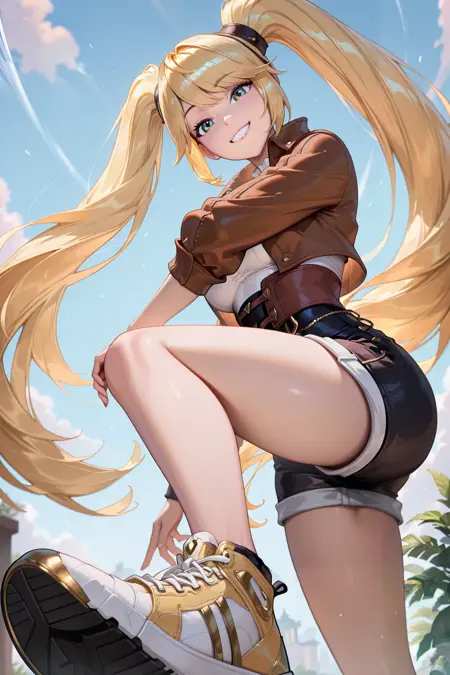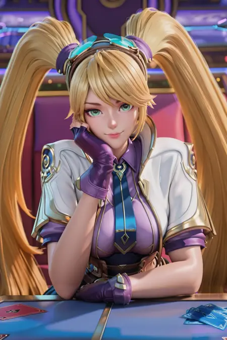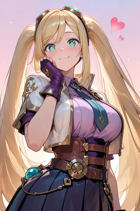 layladefault, 매우 긴 머리, 금발, 더블테일, 앞머리, 머리에 안경, 녹색 눈, 보라색 셔츠, 파란색 넥타이, 짧은 소매, 열린 재킷, 흰색 재킷, 크롭된 재킷, 벨트, 파란색 스커트, 주름 스커트, 손가락 없는 장갑, 보라색 장갑, 검은색 허벅지 스타킹, 흰색 하이힐 부츠레이라 기본 버전 (리바이브 이전):
