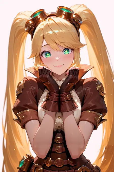 layladefault, 매우 긴 머리, 금발, 더블테일, 앞머리, 녹색 눈, 머리에 안경, 손가락 없는 장갑, 스팀펑크 복장, 갈색 드레스, 짧은 소매, 스커트레이라 아스피러ント: