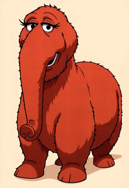 MrSnuffleupagusSS, 1boy, elephant, large brown shaggy fur, with big friendly black eyes, long trunk, big black eyelashes, light brown eyelids,