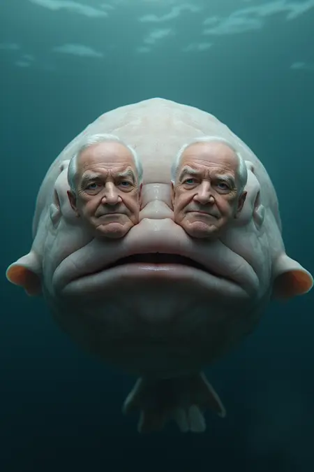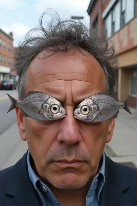 目のかわりに、彼/彼女/それ/彼らの顔の前には2匹の大きな銀色の魚が置かれている。