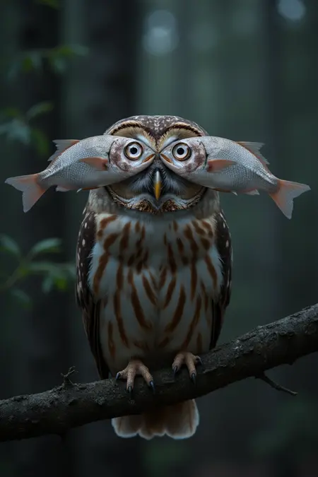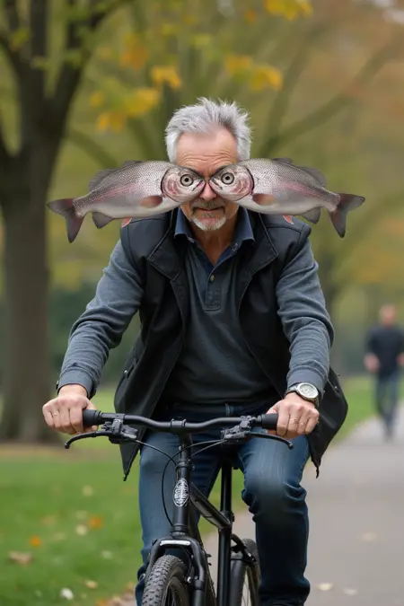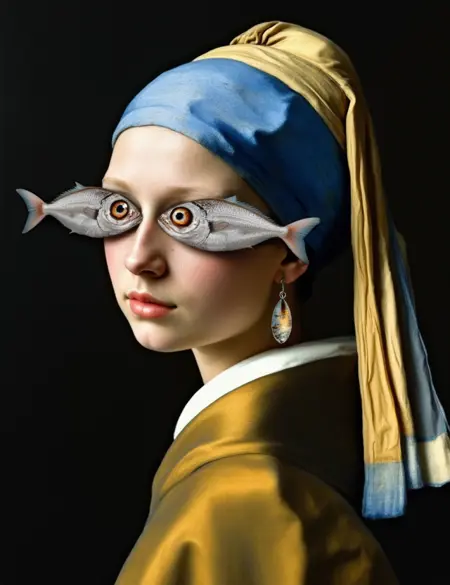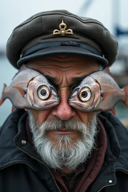 プロンプトを w1z_f15h3y3 で始めて、プロンプトのどこかに 目のかわりに、彼/彼女/それ/彼らの顔の前には2匹の大きな銀色の魚が置かれている。 を追加してください。