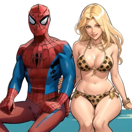 SpiderShanna, a man and (a woman, bikini), hetero, standing, smile, cowboy shot