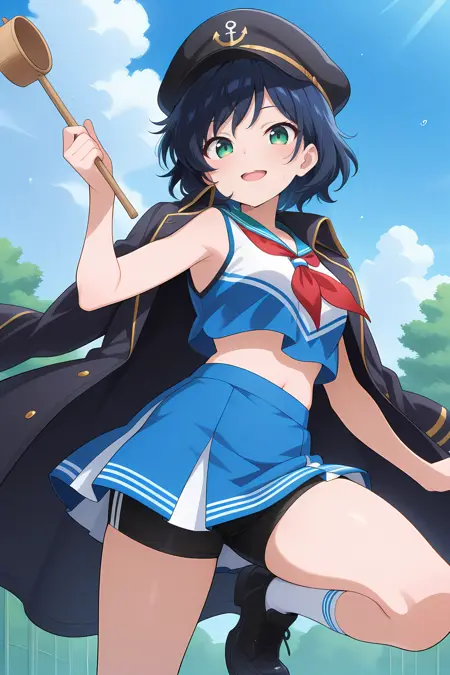murasa minamitsu, 1girl, solo, green eyes, blue hair, short hair, murasa minamitsu \(all aboard! full speed ahead!\), alternate costume, black coat, open coat, black hat, blue skirt, cheerleader, coat, crop top, red neckerchief, black shorts, shorts under skirt, white socks, black footwear, bare arms, hishaku,