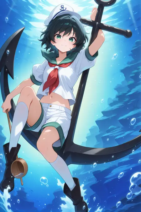 murasa minamitsu, 1girl, solo, green eyes, black hair, short hair, white hat, sailor hat, white shirt, short sleeves, green sailor colar, red neckerchief, white shorts, white skirt, black boots,