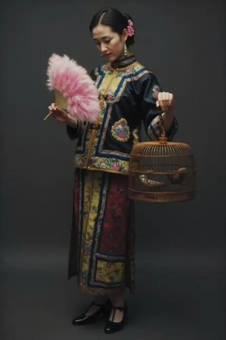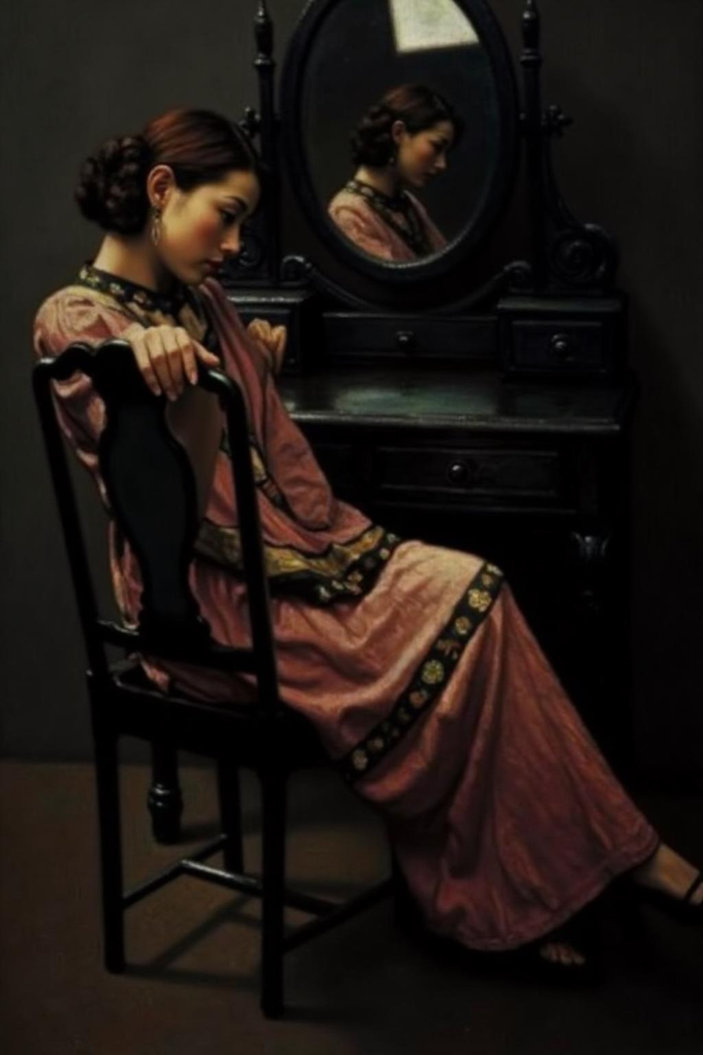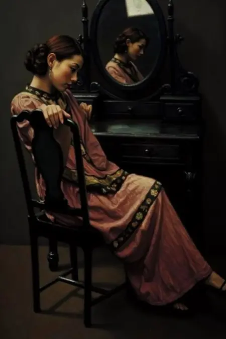 • Lingering Melody 伝統的な中国衣装を纏った女性が静かな瞑想に耽る様子を描いた代表作。柔らかい布地と控えめなトーンの相互作用は、時を超えた感覚を呼び起こします。