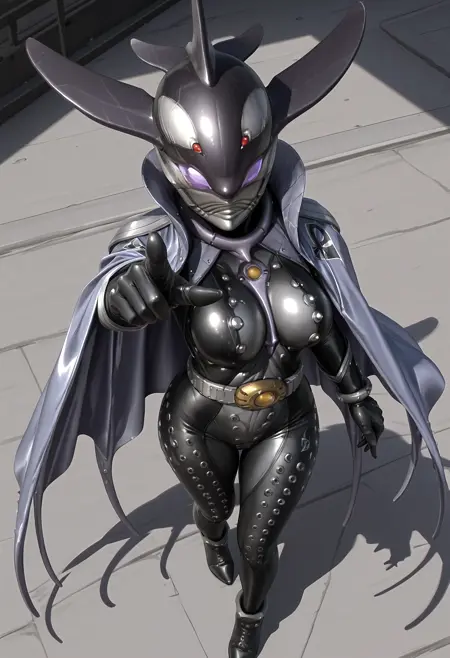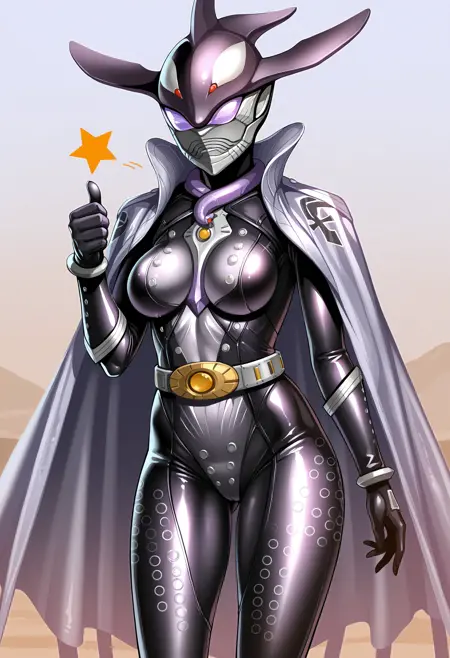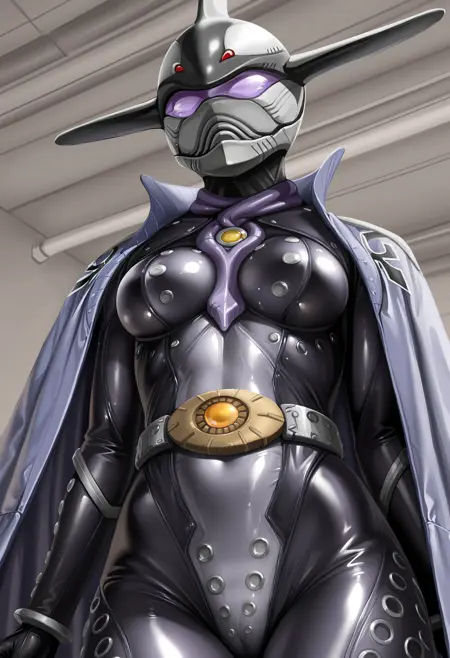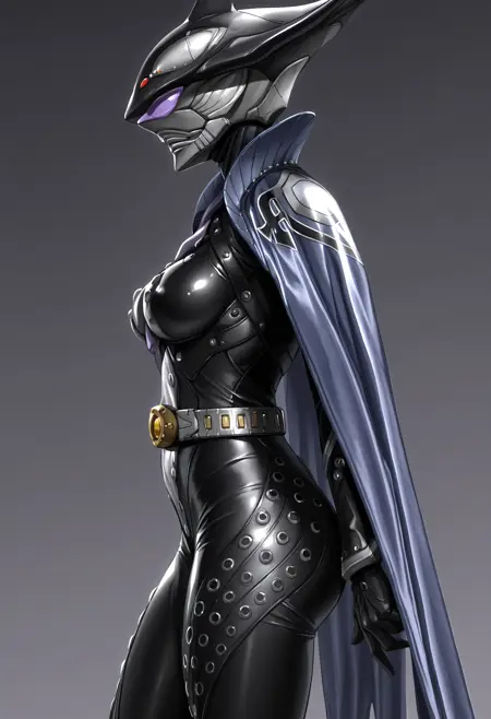 m3zilf, 1girl, 헬맷, 바디수트, 망토, 보라색 비저, 벨트, 가슴, 스킨티트