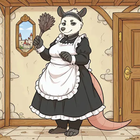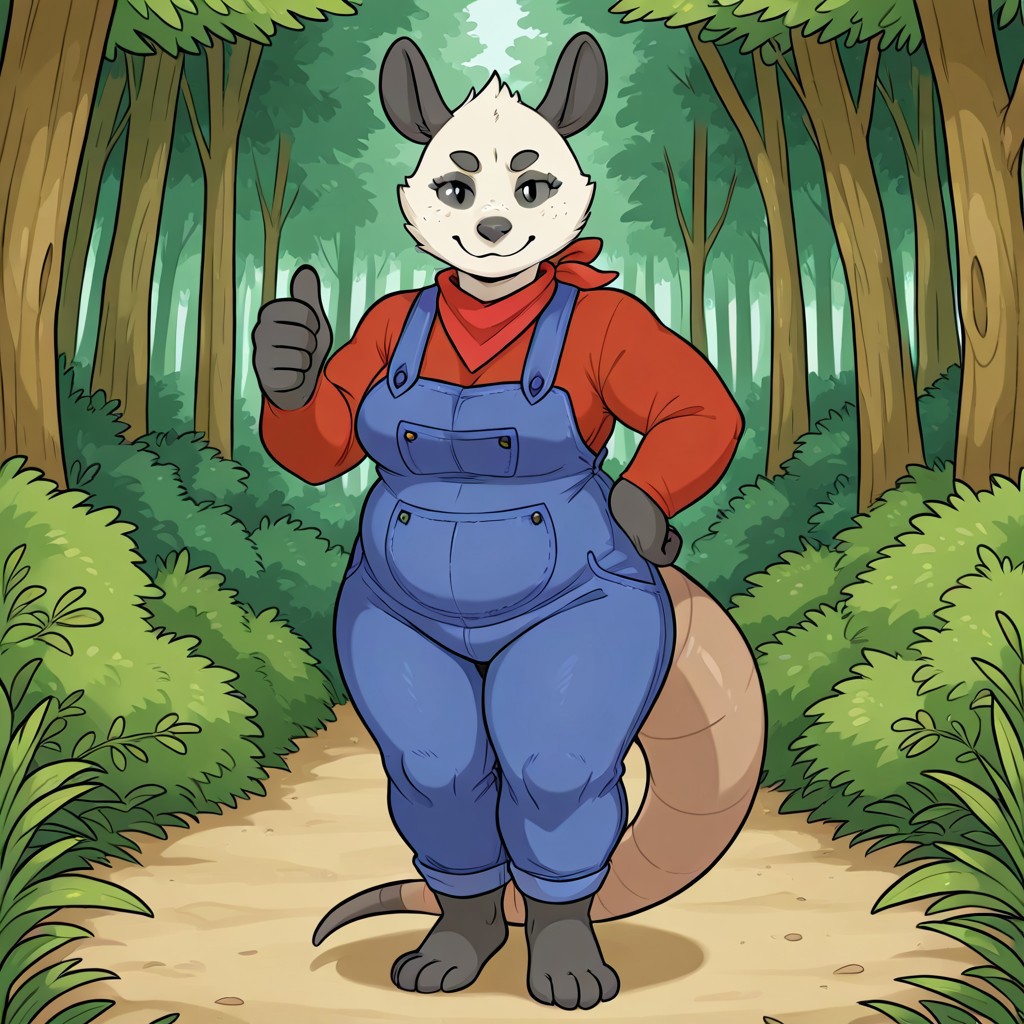 Possum, American opossum, white and black fur, hazel eyes, black nose, thick tail, slightly chubby, muscular body,