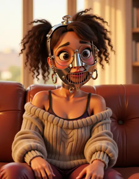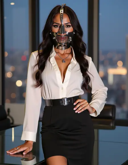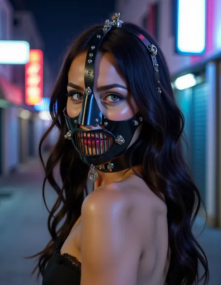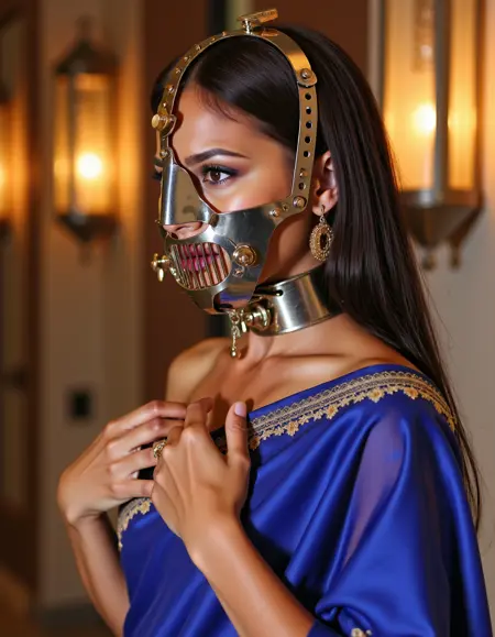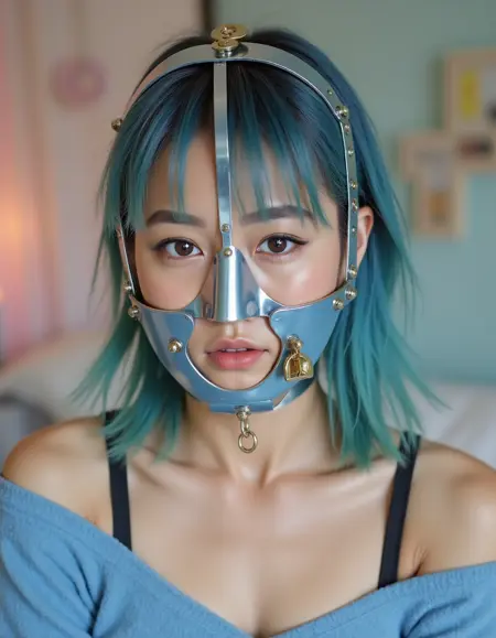 마구 있음: (색상) 잠금 금속 마스크를 입고, 입에 마구가 달려 있음