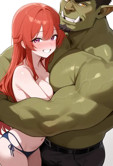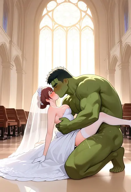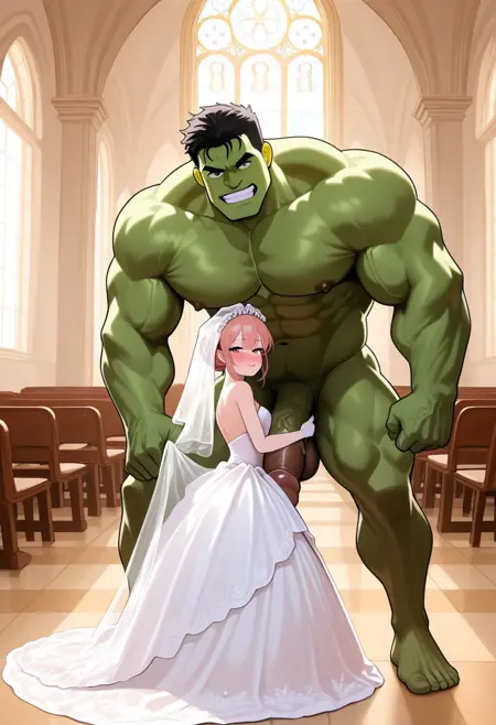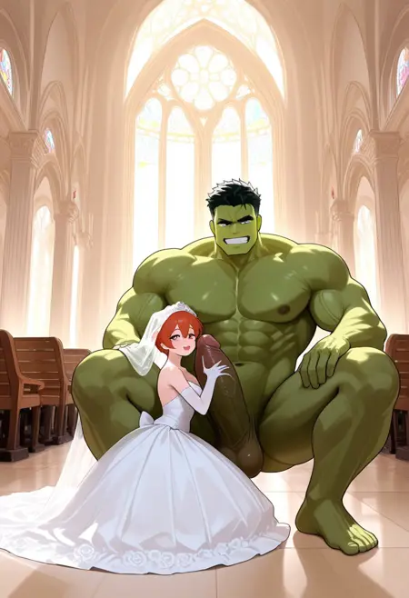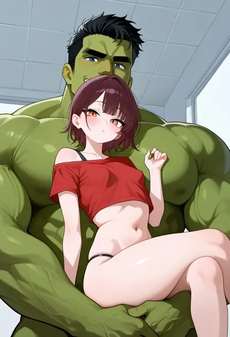 score_9,score_8_up,score_7_up, small sub and huge dom, size difference, 25歳の女性サブがベッドでハルクのドムを抱きしめる