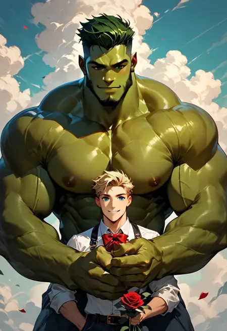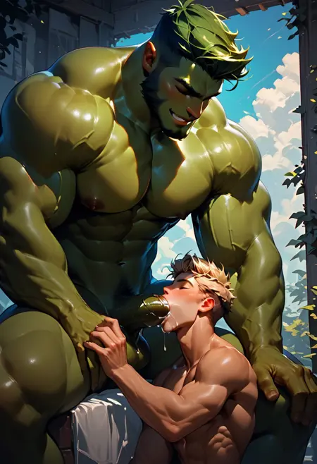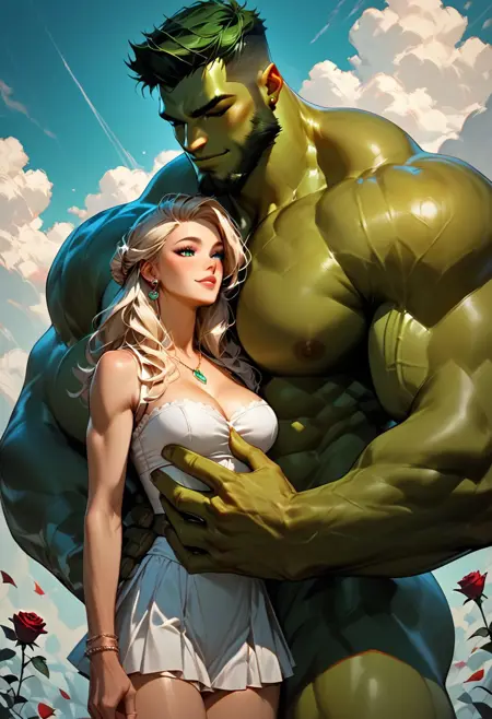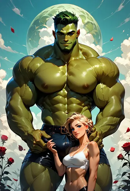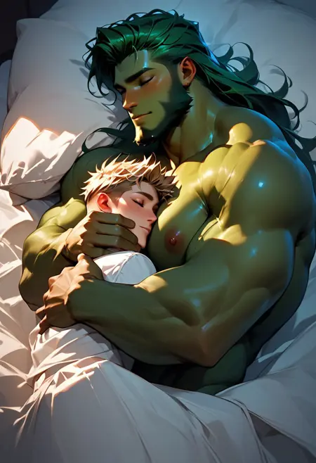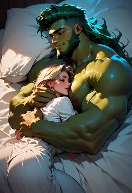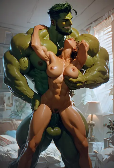 score_9,score_8_up,score_7_up, small sub and huge dom, size difference, 25岁女性配角在床上拥抱浩克主角