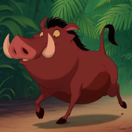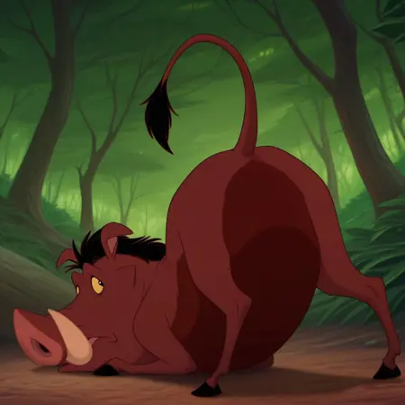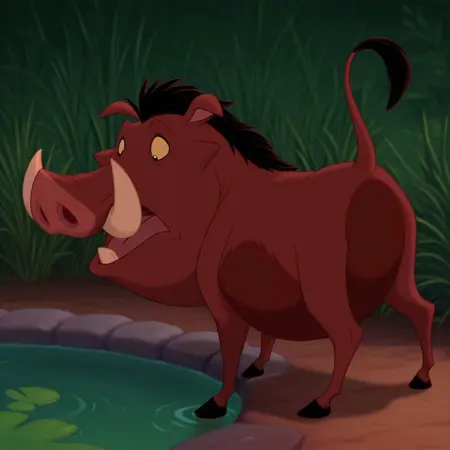 Pumbaalkil, feral, male, warthog, brownish-red fur, tusks, yellow sclera, black eyes, black hair, black tail tuft, hooves,
