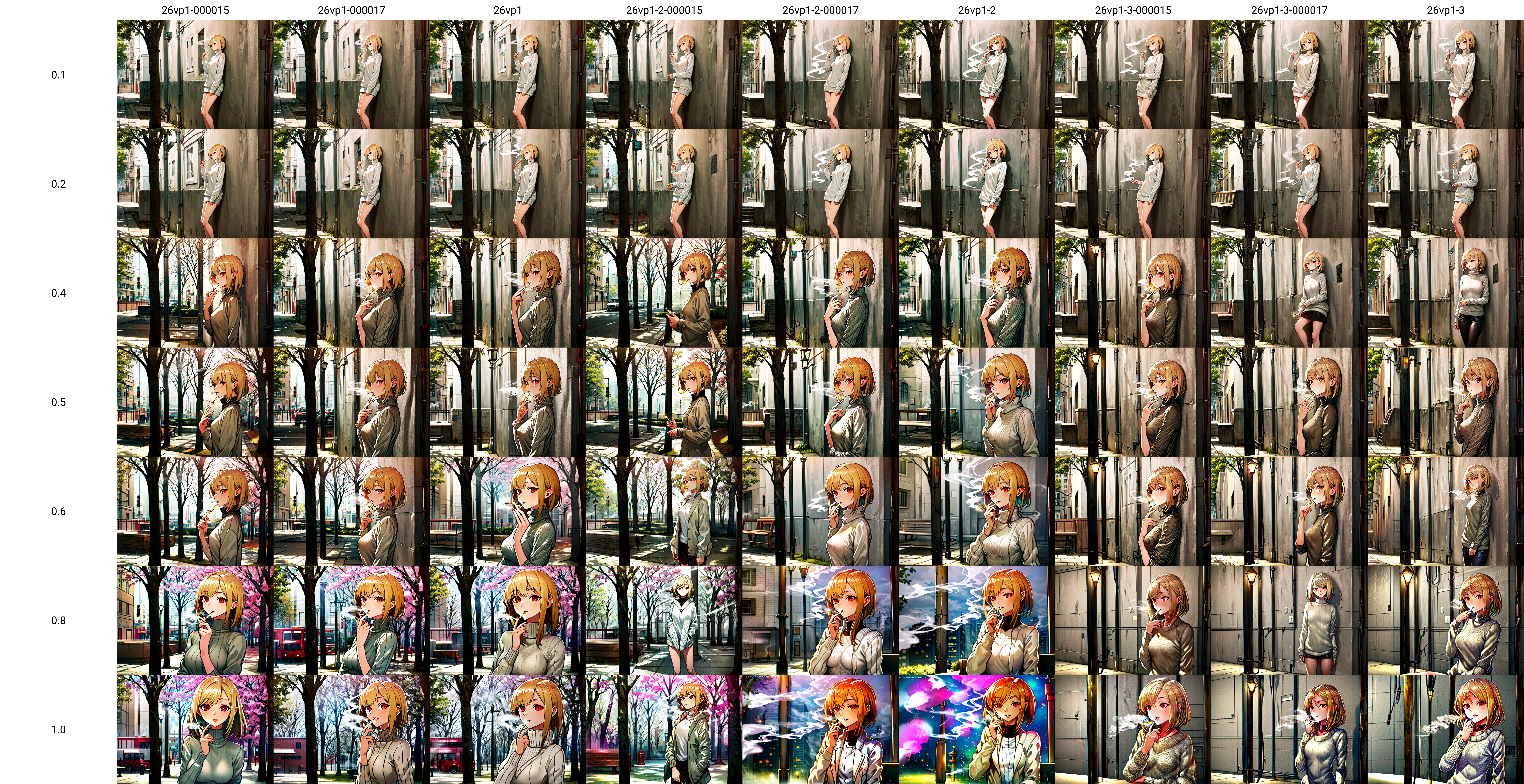 또한 CLIP skip 2를 사용해 주세요. kl-f8-anime2 VAE를 26vp1 계열 모델에 적용하는 것은 추천하지 않습니다. 정말로 그럴 필요가 없다면요. 그렇지 않다면, 모든 26vp1 계열 모델과 담배를 피우는 금발 소녀가 포함된 XY 플롯을 확인해 주세요.