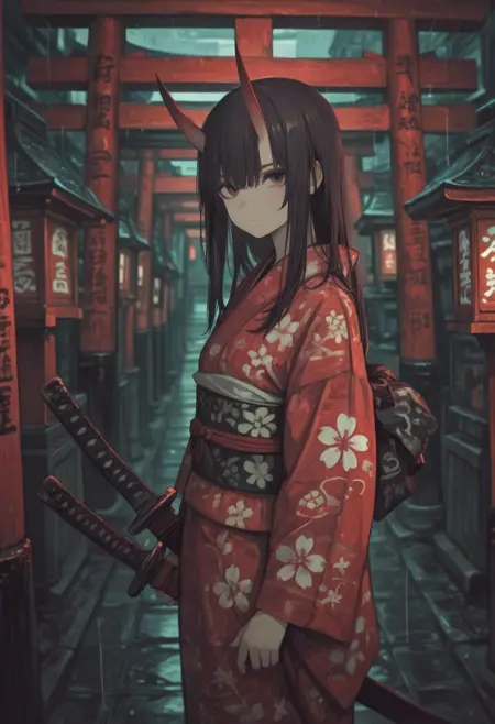 1girl, armor, bangs, black hair, blurry, blurry background, blurry foreground, closed mouth, ema, expressionless, holding, holding sheath, holding sword, holding weapon, japanese clothes, katana, kimono, long hair, long sleeves, looking at viewer, multiple swords, multiple torii, new year, obi, oil-paper umbrella, oni, outdoors, pagoda, paper lantern, red eyes, red kimono, sash, scabbard, sheath, sheathed, solo, standing, sword, torii, weapon, wide sleeves