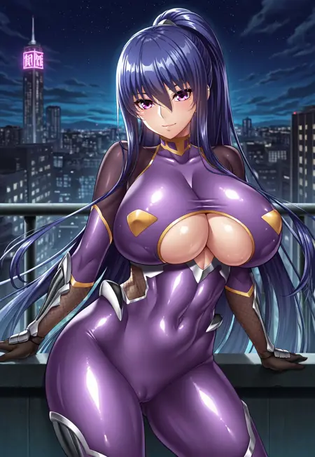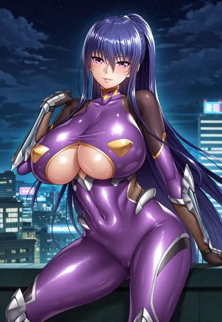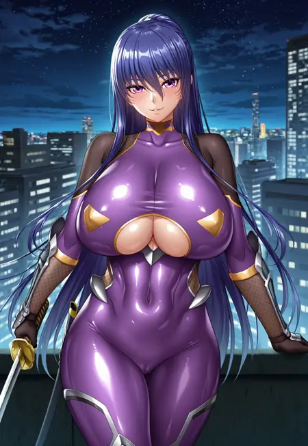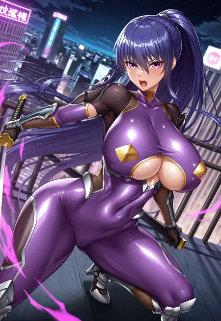 Outfit 1: ninja, taimanin suit, impossible bodysuit, impossible clothes, turtleneck, armor, arm guards, purple bodysuit, underboob, clothing cutout, cleavage cutout, fishnets, covered navel, gloves, skindentation, shiny clothes, kote