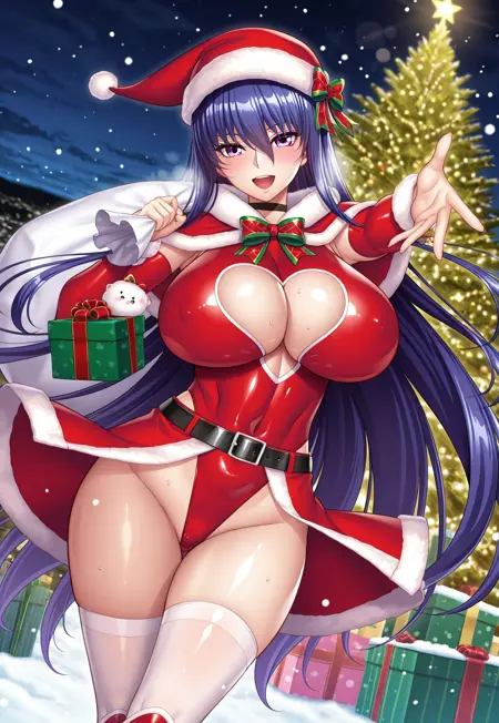 Outfit 6: christmas, santa costume, santa hat, highleg leotard, red leotard, clothing cutout, cleavage cutout, heart cutout, white thighhighs, red boots, black belt, showgirl skirt, red skirt, fur trim, red cape, fur-trimmed cape, plaid ribbon, red ribbon