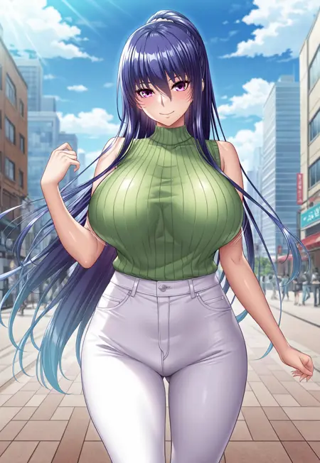 Tags: akiyama rinko, long hair, blue hair, purple eyes, thick lips, large breasts, huge breasts, curvy, shiny skin,