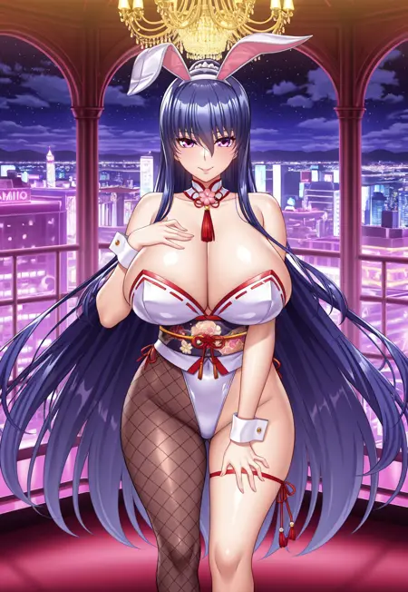 Outfit 9: revealing clothes, playboy bunny, bunny ears, purple bunny ears, detached collar, red tassel, neck tassel, cleavage, strapless, strapless leotard, white leotard, highleg leotard, red ribbon, ribbon trim, floral belt, red thigh ribbon, obi, sash, flower accessory, pink flower, thigh-high stocking, pantyhose, fishnet pantyhose, asymmetrical legwear, wrist cuffs, white cuffs