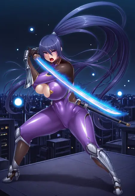 복장 1: 닌자, 타이마닌 유니폼, 불가능한 바디수트, 불가능한 옷, 터틀넥, 갑옷, 팔 보호대, 보라색 바디수트, 언더부브, 옷 자른 부분, 젖가슴 자른 부분, 피시넷, 배꼽 가린 부분, 장갑, 피부 접힘, 윤기 나는 옷, 코테