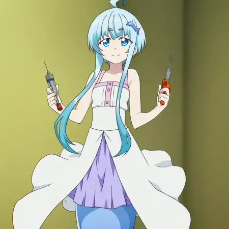 Main outfit: white dress, purple skirt, bare shoulders, dress straps