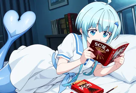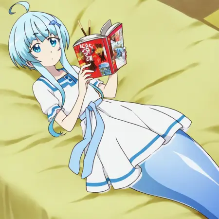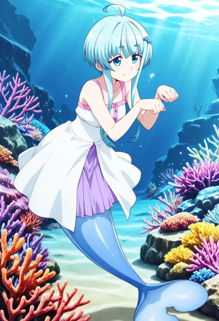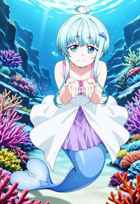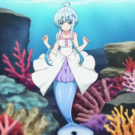 외모: 파란 머리, 단발, 옆머리, 긴 머리카락이 있는 단발, 아호게, 돌고래 모양 머리핀, 파란 눈, 몬스터 걸, 인어, 인어 꼬리, 파란 꼬리