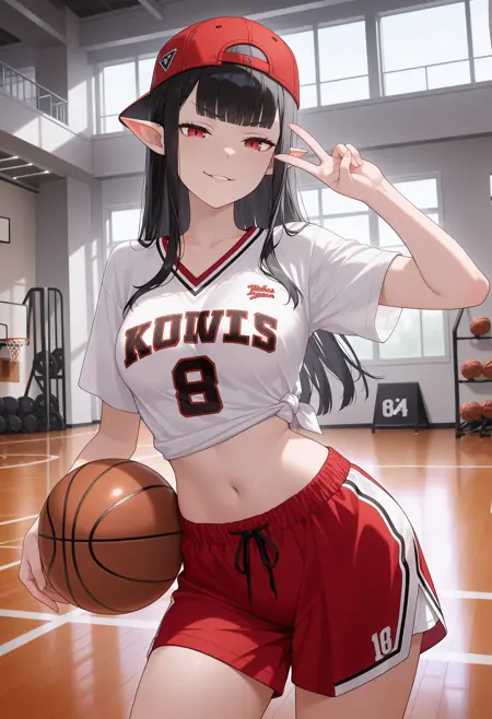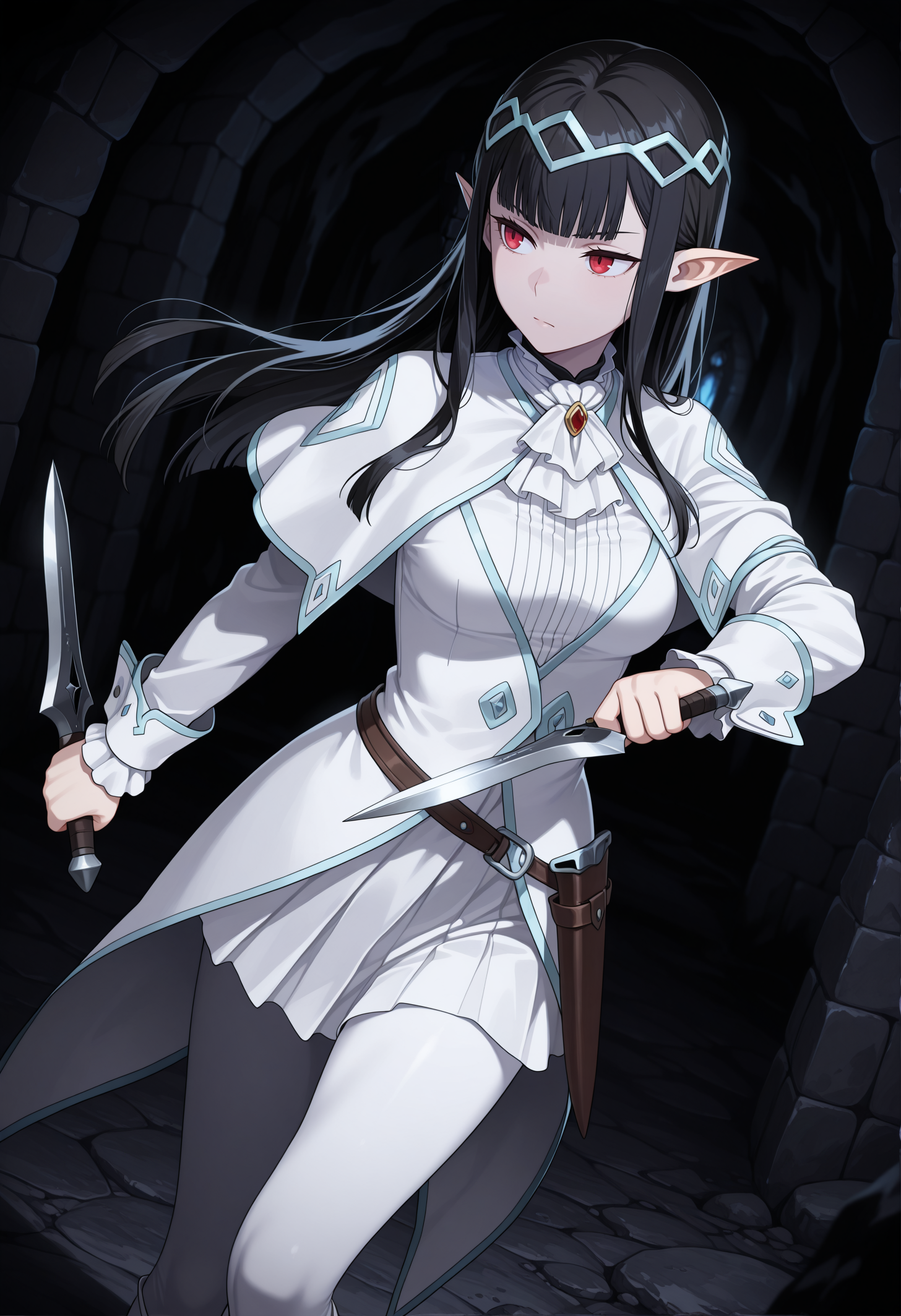KJOfilvis, black hair, red eyes, blunt bangs, pointy ears, sidelocks, long hair, hair ornament,