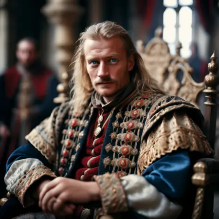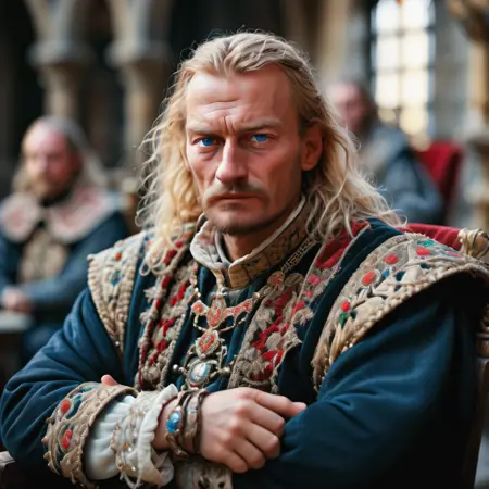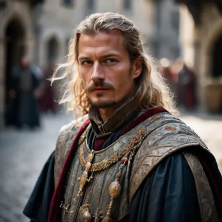 1boy, 2boys, 6+boys, architecture, armor, ascot, bald, barrel, beard, black hair, blonde hair, blue eyes, blurry, blurry background, blurry foreground, bowl, bracelet, brown eyes, brown hair, building, candle, cape, chainmail, chair, chalice, closed mouth, cloud, crowd, crown, cup, dark skin, dark-skinned male, day, depth of field, earrings, embroidered collar, embroidered jacket, embroidered vest, facial hair, fantasy, food, green eyes, grey eyes, grey hair, hat, holding, hood, horse, indoors, jewelry, leather collar, lips, long hair, long sleeves, looking at viewer, looking to the side, male focus, manly, messy hair, metal collar, multiple boys, mustache, necklace, noble (man), old, old man, outdoors, parted lips, pauldrons, plate, portrait, realistic, ring, robe, scar, scar across eye, scar on face, scarf, short hair, shoulder armor, signature, simple background, sitting, sky, smile, solo, solo focus, standing, stubble, sword, table, thick eyebrows, upper body, weapon, white hair, wrinkled skin