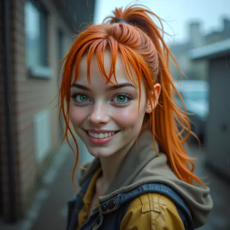 #3. 一位年轻女性站在雨中微笑,拥有一头亮丽的红色长发,扎成马尾,眼神柔和。照片采用电影级布光。