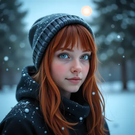 #1. 创建一幅8K分辨率的亲密、超写实3D渲染图,展现一位红发年轻女性的面容。大雪在她周围猛烈飘落,每一片雪花清晰可见,在光线下闪闪发光。强大的月光穿透树冠洒落。