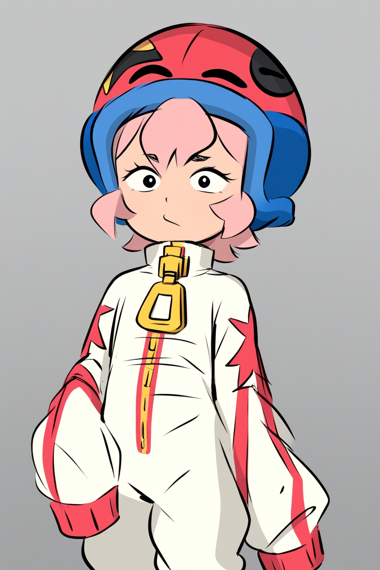 bonnibylicj, 1girl, pink hair, short hair, black eyes,white bodysuit, sleeves past wrists,helmet, red helmet,red cuff ,zipper ,