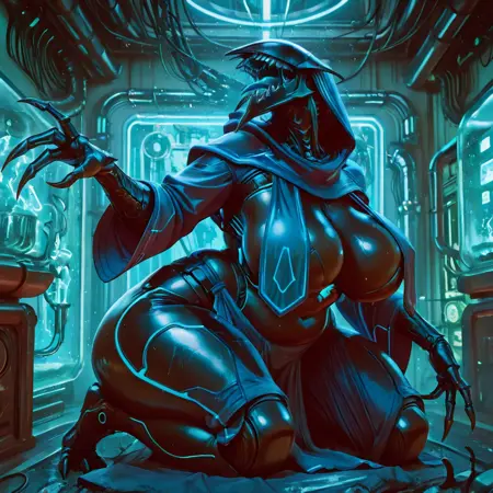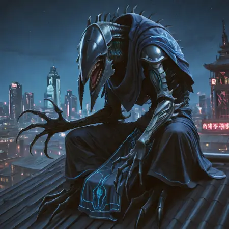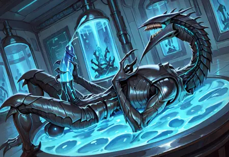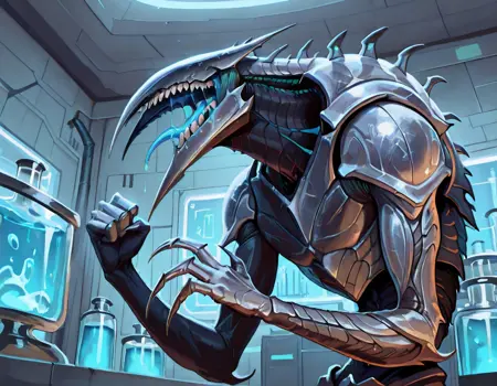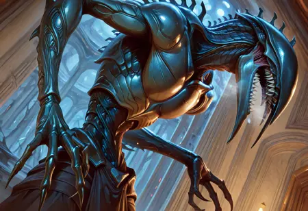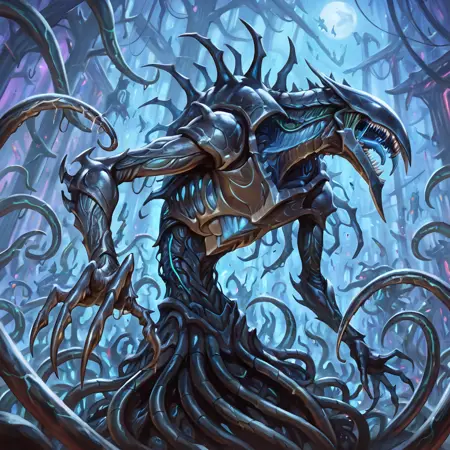 Tags: phyrexian, armored skin, eyeless, monster, teeth [ or sharp teeth], claws, unique lower body (optional), metal tentacles (optional), open mouth (optional)