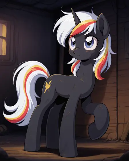 vlr-mlpoc, pony, unicorn, white hair with red and yellow streaks, dark gray body, blue eyes