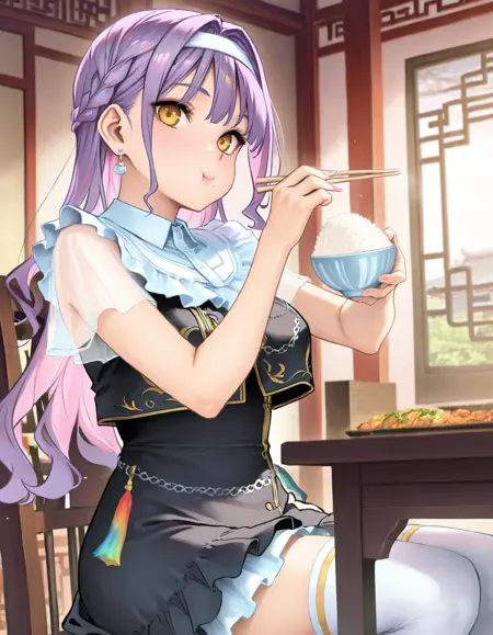 TUT Elna,long hair, purple hair, dress, thighhighs, jewelry, hairband, earrings, yellow eyes, white hairband, white thighhighs, braid, black dress, see-through