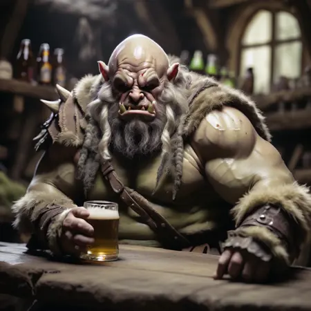 1boy, 1girl, alcohol, armor, bald, beard, beer, belt, black border, black hair, blood, blue eyes, blurry, blurry background, braid, breastplate, breasts, brown eyes, brown hair, candle, cape, chainmail, cleavage, closed mouth, colored sclera, colored skin, cup, elf, facial hair, fur trim, genderswap, genderswap (mtf), gloves, glowing, glowing eyes, green eyes, grey hair, holding, holding cup, holding sword, holding weapon, indoors, jewelry, lips, long hair, looking at viewer, male focus, manly, mug, muscular, necklace, old, old man, one eye closed, orc, outdoors, pauldrons, pillarboxed, pointy ears, pouch, rain, realistic, red eyes, red hair, ring, scar, scar on face, shoulder armor, sitting, solo, solo focus, statue, sword, table, twin braids, upper body, weapon, white hair, wrinkled skin, yellow eyes