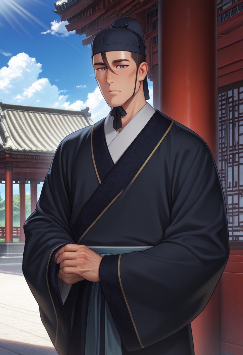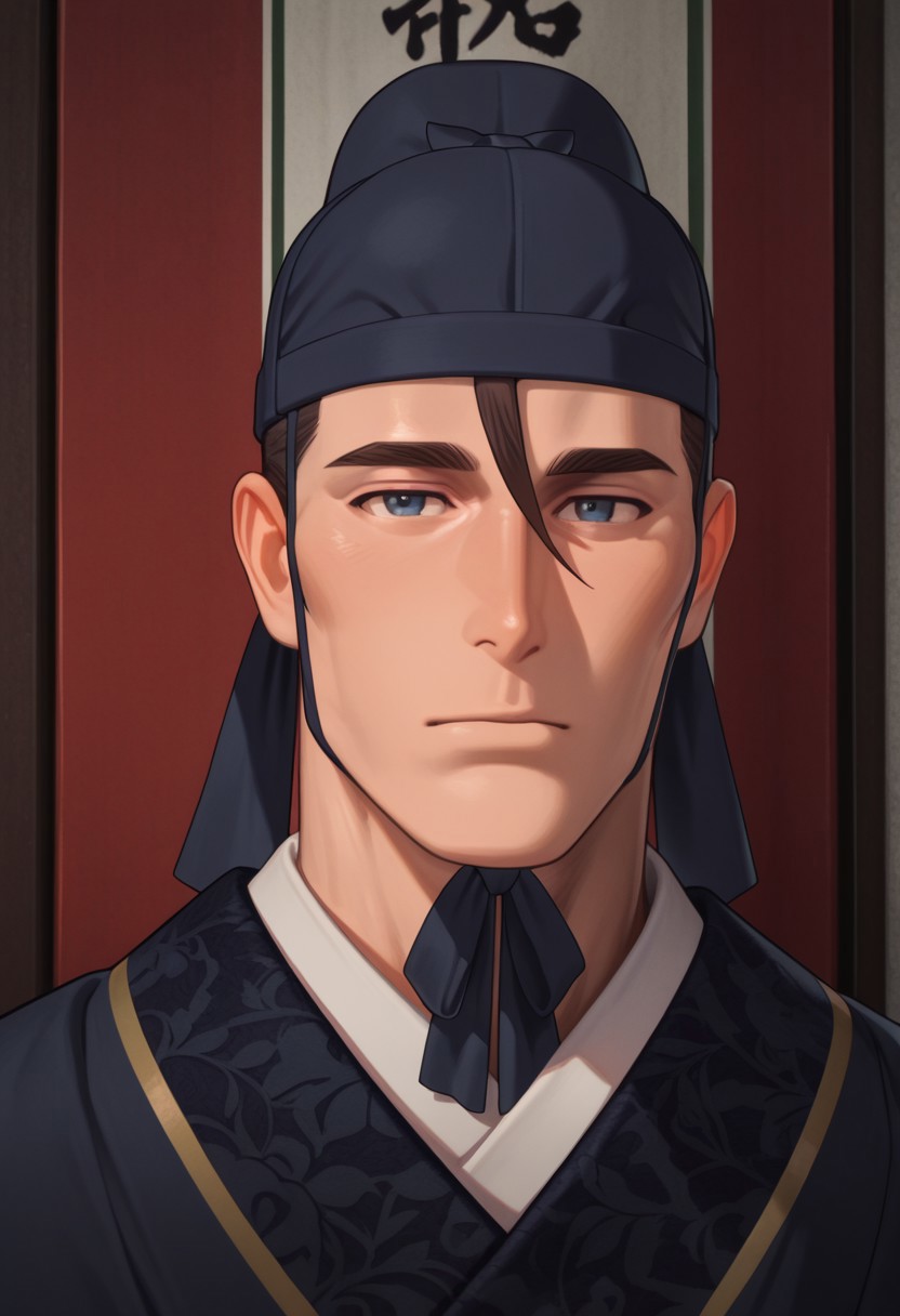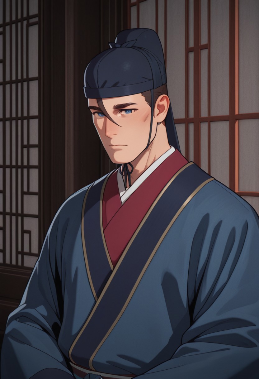 시각: 1남자, 성숙한 남성, 노화된 얼굴 주름, 파란 눈, 갈색 머리, 단발, 긴 앞머리