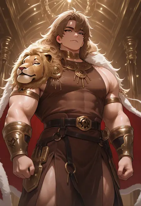 (Decoration in the form of a lion's head on the right shoulder: 1.5),110n_4rm0r, (Decoration in the form of a lion's head on the right shoulder: 1.5), armor,shirtsless, reddish-brown tunic, bracers, belt with golden ornaments, bronze-toned items, complete with a fur cape,