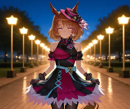 north flight \(umamusume\), hat, skirt, gloves, sleeveless dress, black pantyhose, black footwear, bare shoulders, hairclip, bow, ribbon,