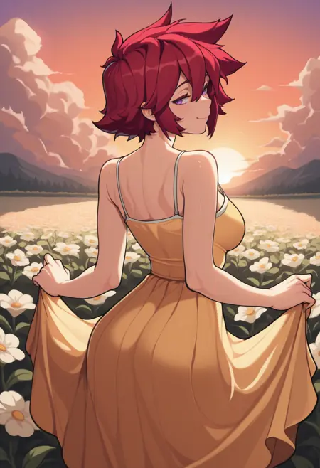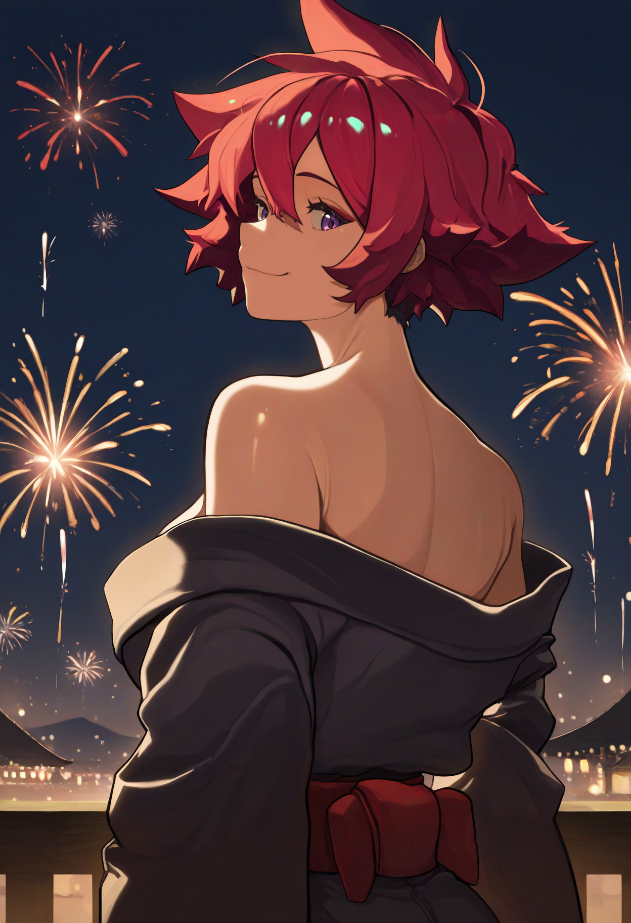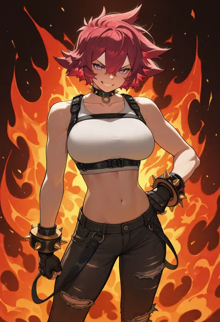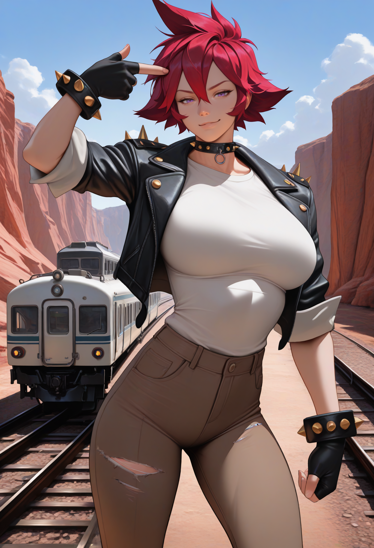 트리거 + 외모: j0na, 단발, 빨간 머리, 솟아오른 머리, 눈 사이의 머리카락, 보라색 눈, 큰 가슴