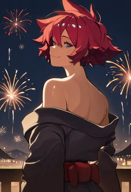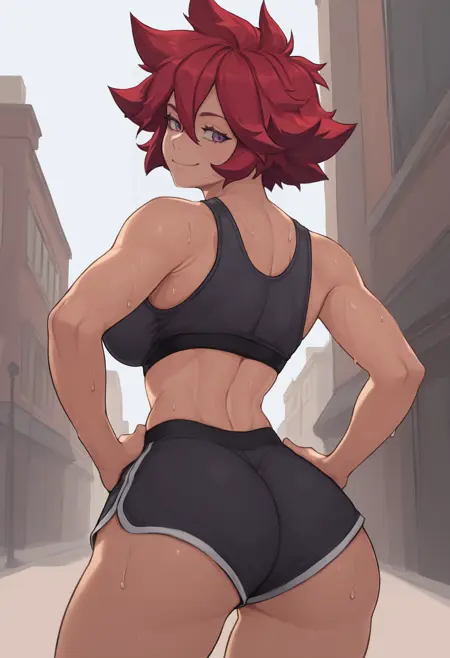 トリガー+外見: j0na, 短い髪, 赤い髪, 立ち上がった髪, 目の間の髪, 紫の目, 大きな胸