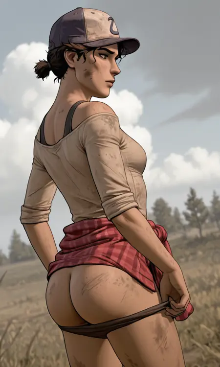 clementinetwd, 1girl, solo, short hair, brown hair, twintails, baseball cap, red flannel tied around waist, off-shoulder shirt, tank top