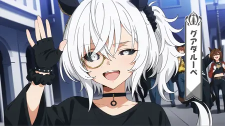guadalupe, white hair, wolf cut, asymmetrical hair, black wrist scrunchie, antenna hair, side ponytail, black sclera, white eyes, messy hair, monocle, monocle chain,