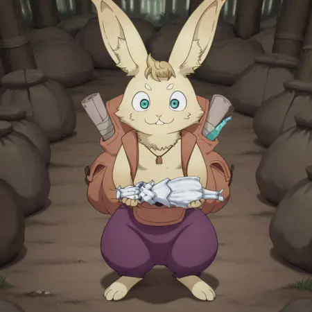 PeatzslfIL, semi-anthro, male, rabbit, cream blonde fur, turquoise eyes, disproportionately large backpack, belt, belt pouch, necklace, loose purple pants