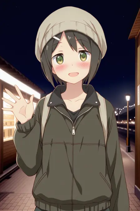kaede, 1girl, black hair, hairclip, hat, pantyhose, jacket, winter,