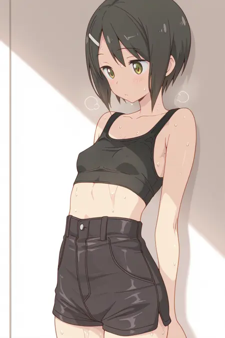 kaede, 1girl, black hair, hairclip, striped sweater, black straps, no pants, collarbone,