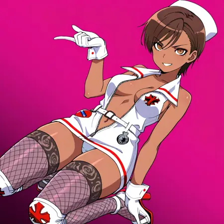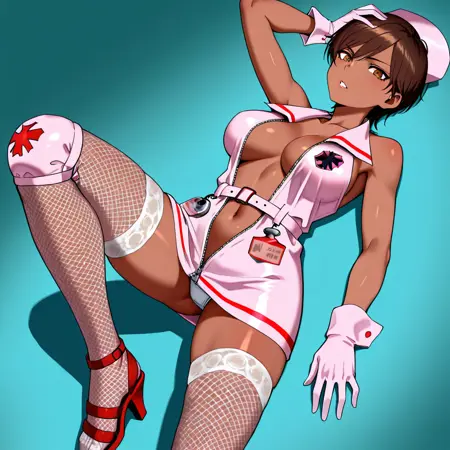 RRXX_Anesthesia, 1girl, solo, brown eyes, short hair, brown hair, dark-skinned female, navel, pantyshot, nurse cap, pink nurse outfit, unzipped, open clothes, belt, white gloves, gloves, fishnet thighhighs, knee pads, high heels
