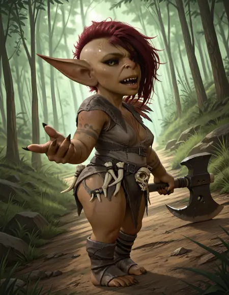 bg3sazza, realistic, 1girl, female goblin, colored skin, red hair, pointy ears, lips, nose, black sclera, green eyes, hair over one eye, hair over left eye, tattoos, shortstack, small breasts, sharp nails