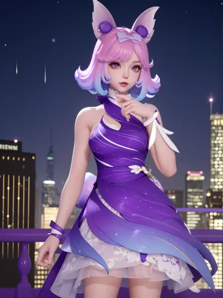 • WZRYdajiZLLZS, 1girl, solo, pink hair,purple dress, multicolored hair, short hair, animal ears, pink eyes, gradient hair,bangs,satchel, jewelry,hair bow,wrist cuffs,sleeveless,barcelet,cityscape, night, looking at viewer, mature female,