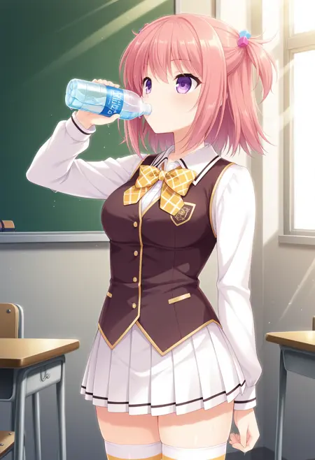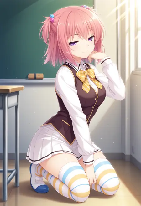 허벅지 긴 양말, 치마, 줄무늬 허벅지 양말, 줄무늬, 학교 복장, 머리 장식, 양측 올리기, 젯타이 리ョ우키, 리본, 주름 치마